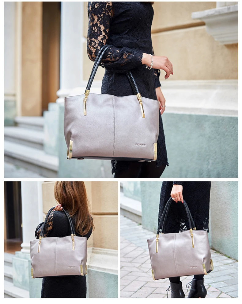 Two Color Options2 color options, black and gray. 2 different colors combined with the exquisite craft of the handbag, forming 2 different styles, you can choose different colour purses according to your style preferences. Sophisticated, elegant and stylish appearance makes FOXER leather womens handbag suitable for many occasions, such as Party, banquet, class reunion, graduation ceremony, wedding, etc. The color of the handbag is chosen by you, so is your life. Large Capacity Большая емкость Both beauty and pragmatism,want beauty,also want it can be loaded Multi-layer functional partition, give your accompanying items a neat home. Handle is designed according to the human engineering,give you perfect experience. Рукоятка разработана в соответствии с человеческой инженерией, дает вам идеальный опыт. More buyer show related product details